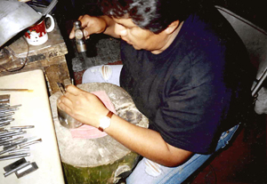 At the age of 10, my father and step-mother would leave home for specially planned “selling” trips that would take all day. The whole day was composed of selling these finish products, eating dinner, buying groceries and feed for our livestock. There were times that I would pick the pad-lock and break into my father’s shop. The shop contained all his tools and machines. There I would make little rings, earrings and polish that which I made. Whatever scraps of silver I could find, I would utilize for my pieces.